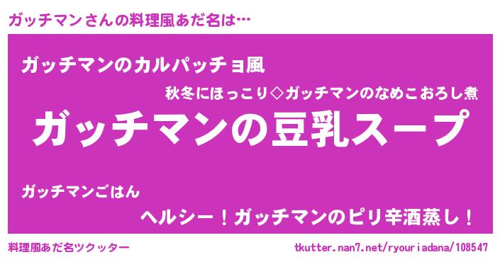 | 胡散臭い通販商品みたいなあだ名 | 『信頼と実績のサプリメント…その名も「ガッチマン」』 |
