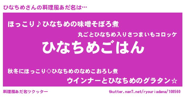 | 男性向けラノベタイトル風あだ名 | 『ヒナチメスレイヤー』『ひなちめの憂鬱』 |