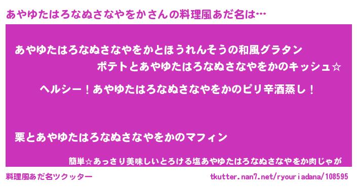 | 男性向けラノベタイトル風あだ名 | 『Re:あやゆたはろなぬさなやをかから始める異世界生活』 |
