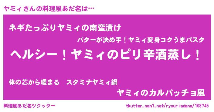 | 男性向けラノベタイトル風あだ名 | 『Re:ヤミィから始める異世界生活』 |