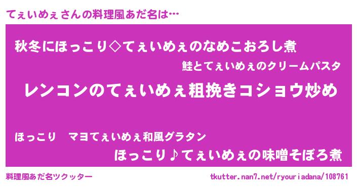 | 意味不明あだ名 | 『自称てぇいめぇ』『ペロリンてぇいめぇ』 |