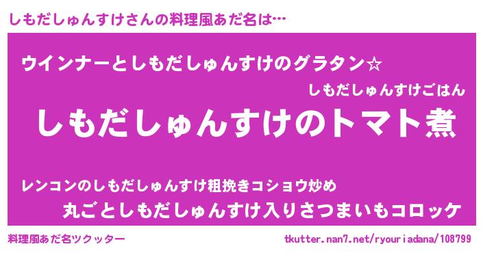 | 男性向けラノベタイトル風あだ名 | 『おまえをオタクにしてやるから、俺をしもだしゅんすけにしてくれ! 』 |