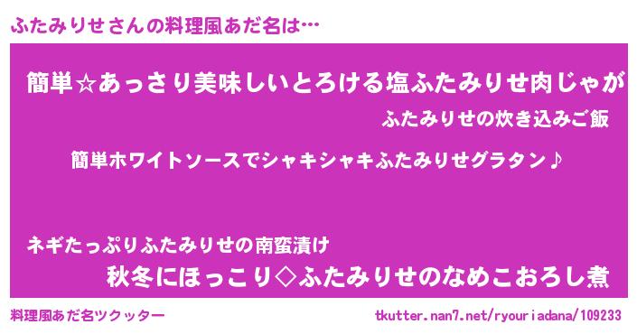 | 女子向けラノベタイトル風あだ名 | 『ふたみりせ様がみてる』 |
