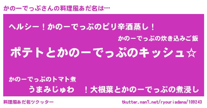 | 女子向けラノベタイトル風あだ名 | 『かのーでっぷの卵を拾いまして』 |
