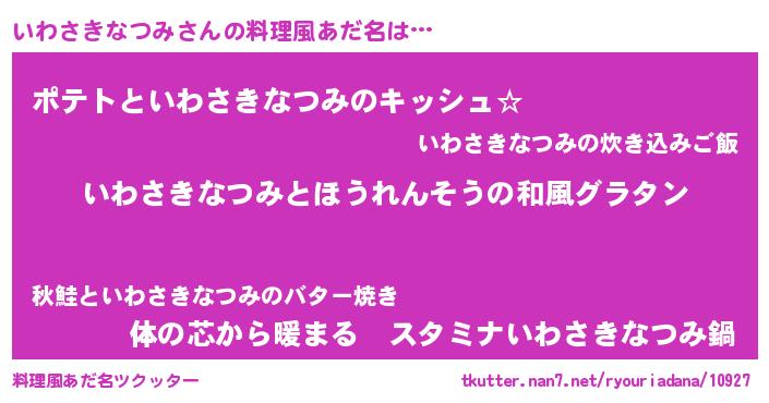 | 男性向けラノベタイトル風あだ名 | 『いわさきなつみ~年齢イコール彼女いない歴の魔法使い~』 |