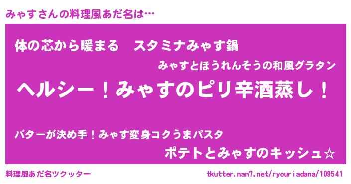 | 男性向けラノベタイトル風あだ名 | 『Re:みゃすから始める異世界生活』 |