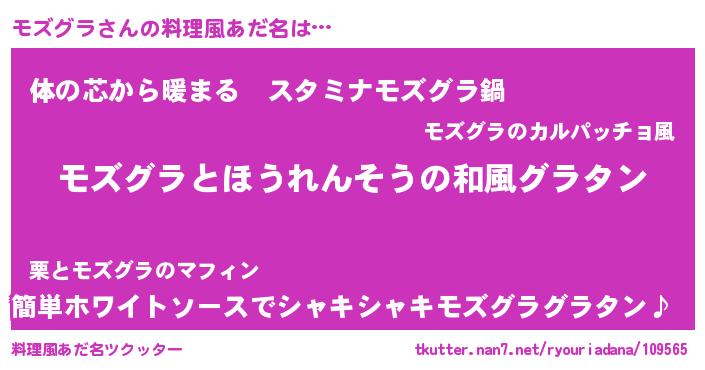 | 男性向けラノベタイトル風あだ名 | 『モズグラ~年齢イコール彼女いない歴の魔法使い~』 |