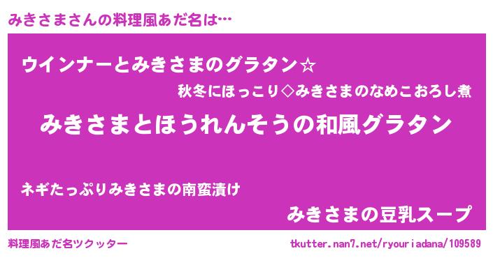 | 男性向けラノベタイトル風あだ名 | 『みきさま~年齢イコール彼女いない歴の魔法使い~』 |