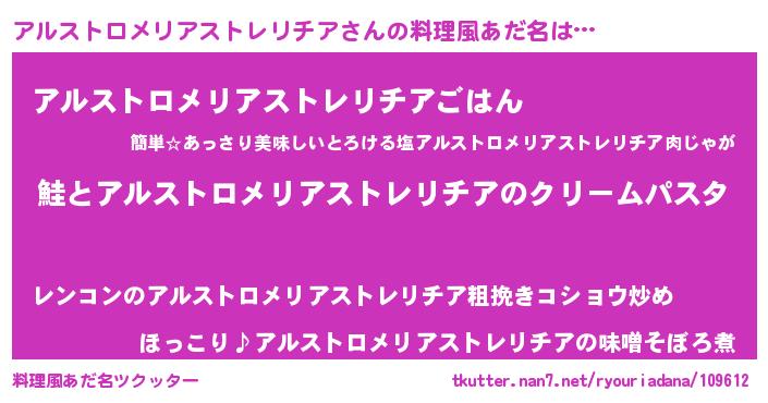 | 女子向けラノベタイトル風あだ名 | 『死神アルストロメリアストレリチアの再婚』 |