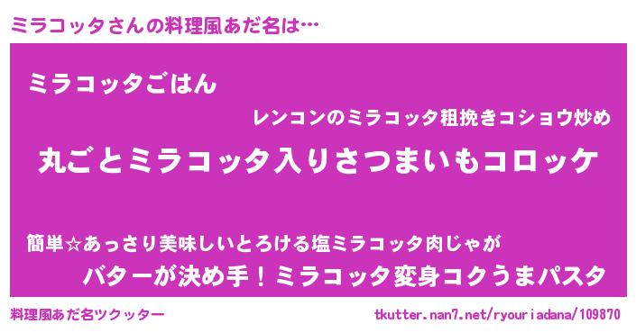 | 男性向けラノベタイトル風あだ名 | 『この素晴らしい世界にミラコッタを!』 |
