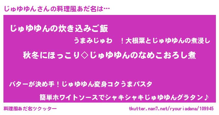 | 男性向けラノベタイトル風あだ名 | 『じゅゆゆんに滅ぼされるだけの簡単なお仕事です』 |
