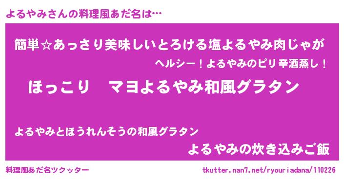 | ヘコむあだ名 | 『よるやみ(笑)』『よるを』 |