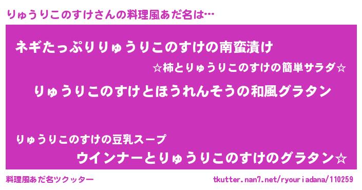 | 女子向けラノベタイトル風あだ名 | 『りゅうりこのすけの玉の輿計画!』 |