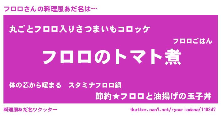 | 男性向けラノベタイトル風あだ名 | 『おまえをオタクにしてやるから、俺をフロロにしてくれ! 』 |