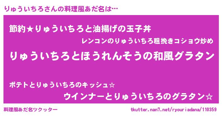 | 男性向けラノベタイトル風あだ名 | 『りゅういちろ~年齢イコール彼女いない歴の魔法使い~』 |