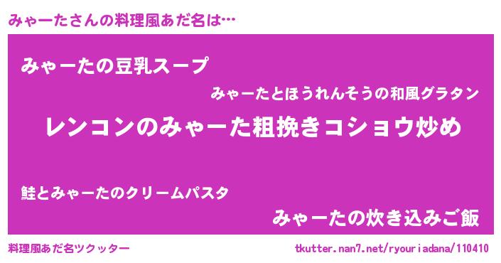 | 意味不明あだ名 | 『自称みゃーた』『なめこ科みゃーた属』 |