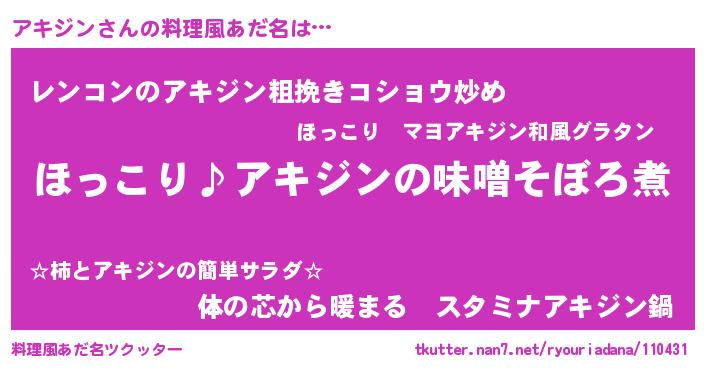 | 意味不明あだ名 | 『ペロリンアキジン』『自称アキジン』 |