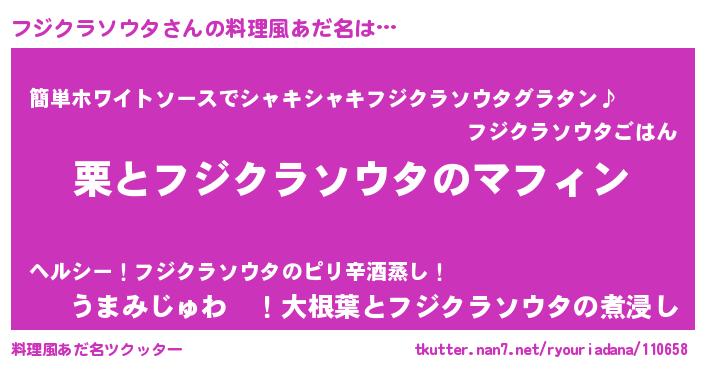 | 胡散臭い通販商品みたいなあだ名 | 『信頼と実績のサプリメント…その名も「フジクラソウタ」』 |