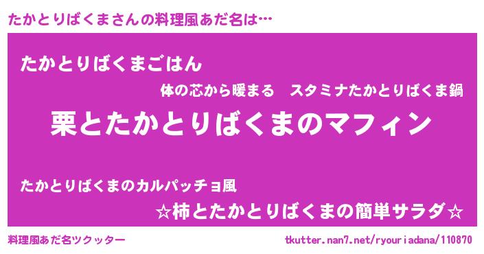 | 男性向けラノベタイトル風あだ名 | 『はたらくたかとりばくまさま!』 |