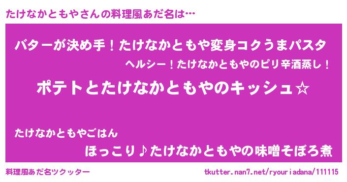 | 女子向けラノベタイトル風あだ名 | 『たけなかともやの卵を拾いまして』 |