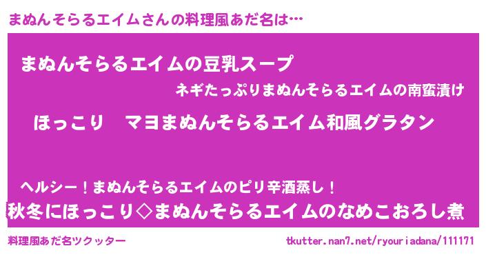 | 欧米人風あだ名 | 『ダレノガレまぬんそらるエイム』 |