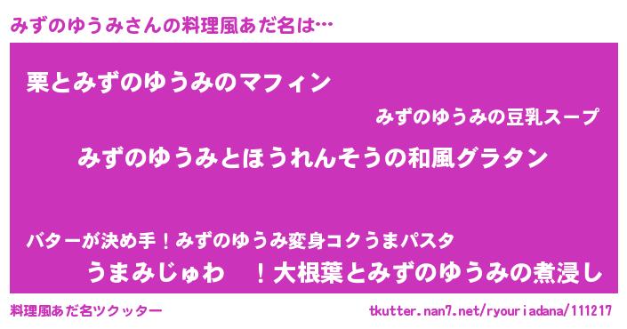 | 男性向けラノベタイトル風あだ名 | 『みずのゆうみ~年齢イコール彼女いない歴の魔法使い~』 |