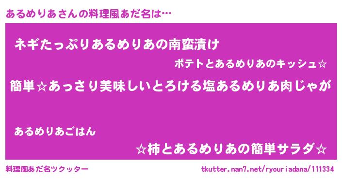 | 胡散臭い通販商品みたいなあだ名 | 『前代未聞の健康食品…その名も「あるめりあ」』 |