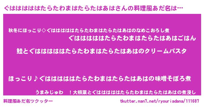 | 男性向けラノベタイトル風あだ名 | 『ノーゲーム・ノーグハハハハハタラタワマハタラタハアハ』 |