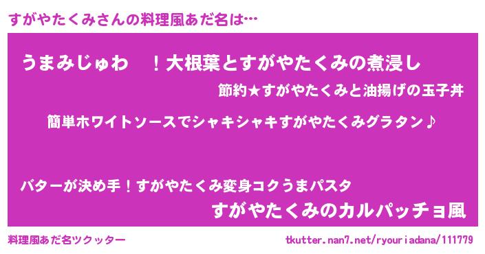 | 男性向けラノベタイトル風あだ名 | 『すがやたくみの嫁は女の子じゃないと思った?』 |