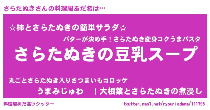 | 胡散臭い通販商品みたいなあだ名 | 『信頼と実績のサプリメント…その名も「さらたぬき」』 |