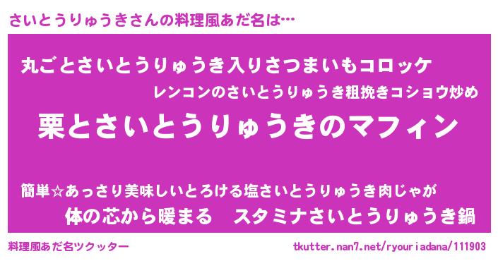 | 意味不明あだ名 | 『住所不定無職さいとうりゅうき(89歳)』 |