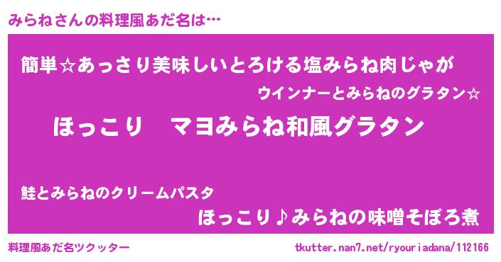 | ヘコむあだ名 | 『みらね(小並感)』『みらにー』 |