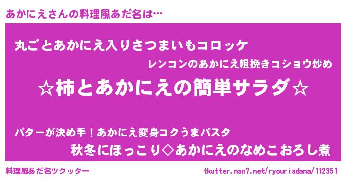 | 男性向けラノベタイトル風あだ名 | 『緋弾のアカニエ』『魔弾の王とあかにえ』 |