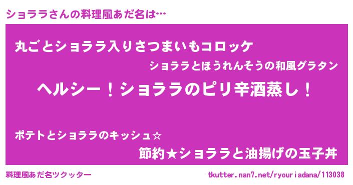| 男性向けラノベタイトル風あだ名 | 『Re:ショララから始める異世界生活』 |