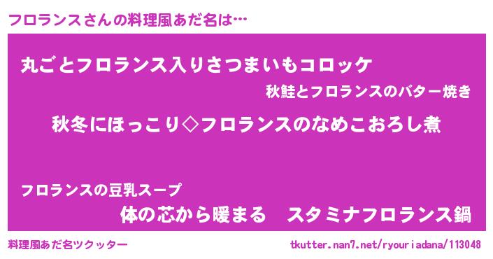 | 男性向けラノベタイトル風あだ名 | 『フロランスに滅ぼされるだけの簡単なお仕事です』 |