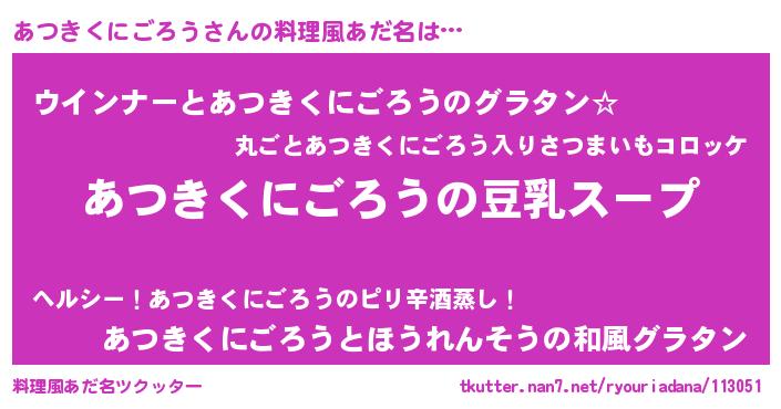 | 女子向けラノベタイトル風あだ名 | 『あつきくにごろうは平凡を望む』 |