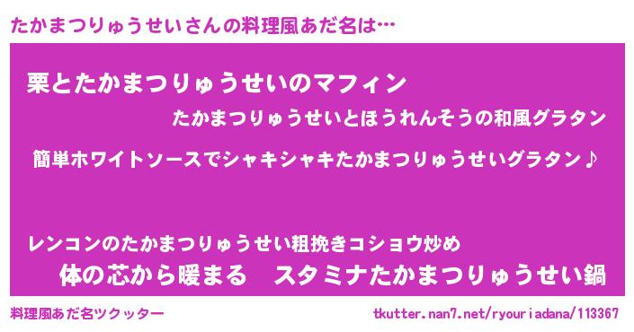 | 男性向けラノベタイトル風あだ名 | 『たかまつりゅうせいの嫁は女の子じゃないと思った?』 |