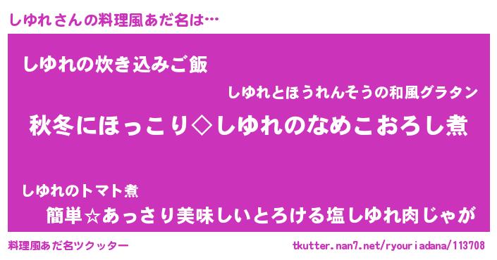 | 男性向けラノベタイトル風あだ名 | 『しゆれに滅ぼされるだけの簡単なお仕事です』 |