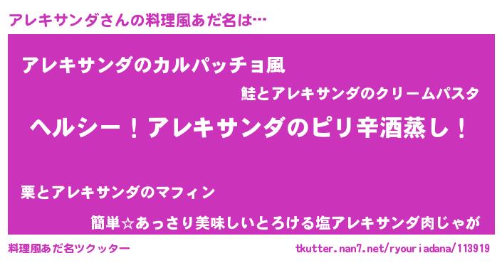| 男性向けラノベタイトル風あだ名 | 『Re:アレキサンダから始める異世界生活』 |