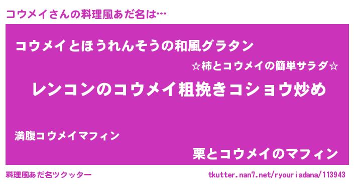 | 意味不明あだ名 | 『自称コウメイ』『なめこ科コウメイ属』 |