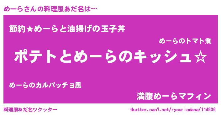 | ヘコむあだ名 | 『めーぷりん』『めーっふぃ~』 |