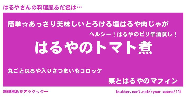 | 女子向けラノベタイトル風あだ名 | 『はるや夫妻のなれそめ』『闇のはるや』 |