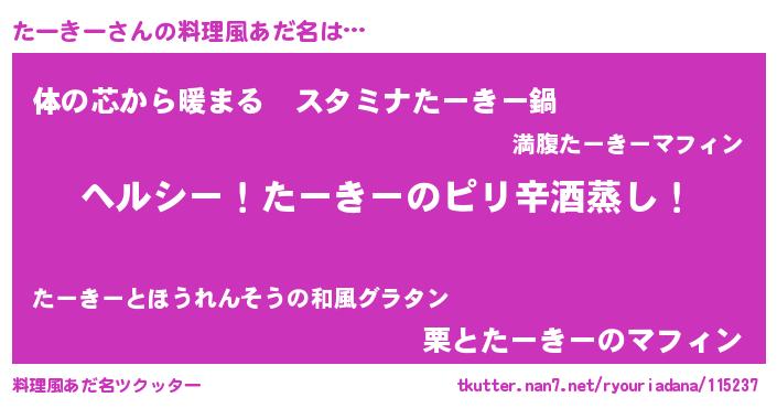 | 女子向けラノベタイトル風あだ名 | 『闇のたーきー』『たーきーの雑貨屋さん』 |
