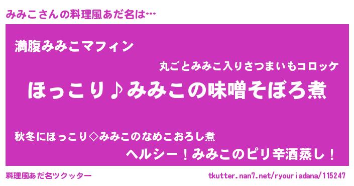 | 女子向けラノベタイトル風あだ名 | 『(仮)みみこのやんごとなき事情』 |