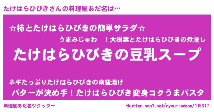 | 男性向けラノベタイトル風あだ名 | 『ダンジョンにたけはらひびきを求めるのは間違っているだろうか』 |