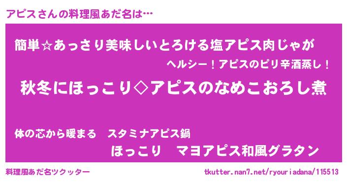 | 意味不明あだ名 | 『永久保存アピス』『自称アピス』 |