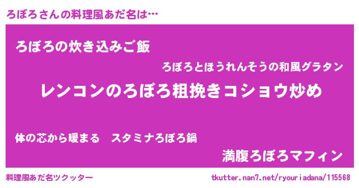 | 意味不明あだ名 | 『自称ろぼろ』『永久保存ろぼろ』 |