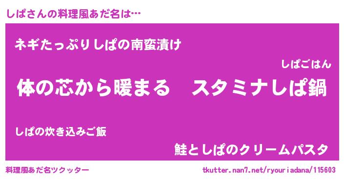 | 女子向けラノベタイトル風あだ名 | 『しぱの雑貨屋さん』『死神しぱの再婚』 |