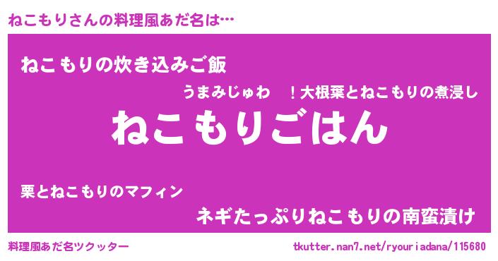 | 男性向けラノベタイトル風あだ名 | 『転生したらねこもりだった件』 |