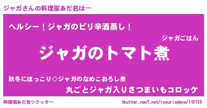 | 男性向けラノベタイトル風あだ名 | 『おまえをオタクにしてやるから、俺をジャガにしてくれ! 』 |